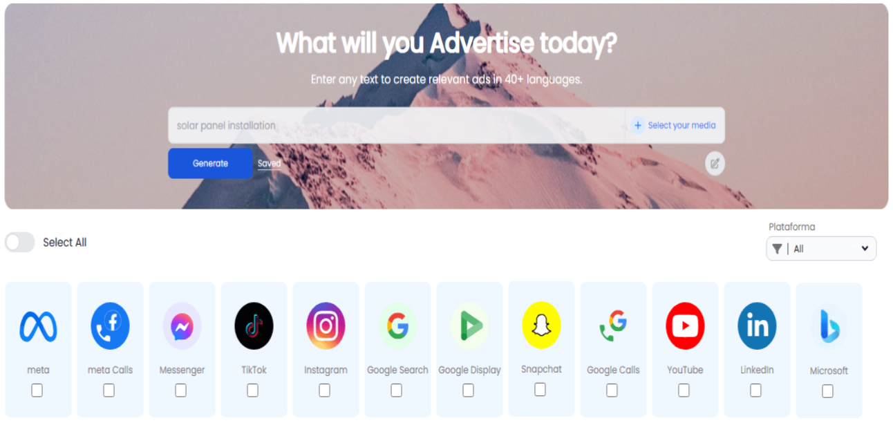Just enter a brief description of the product or service you want to sell and the system will create the entire campaign for the platform you choose, inserting all titles, descriptions, keywords, copies, images, videos, etc. Then just click "create", and that's how you create ads with AI.